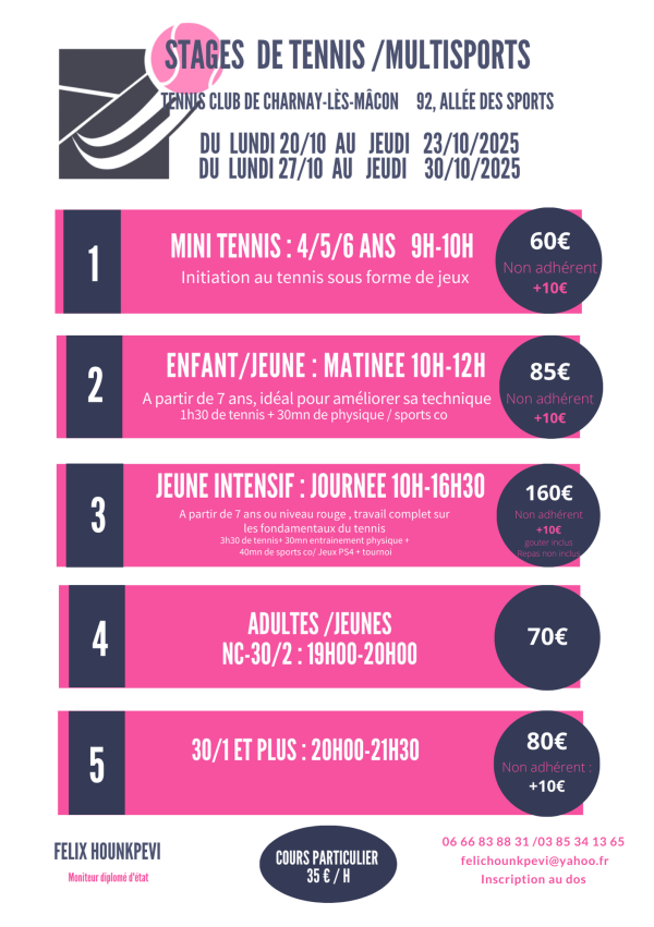 Classé 1/6 , ancien joueur professionnel et ancien joueur de Coupe Davis pour son pays le Benin , Félix apporte sa bonne humeur, sa rigueur et son energie . Ses cours sont dynamiques, variés et ludiques pour le plaisir des grands et des petits .